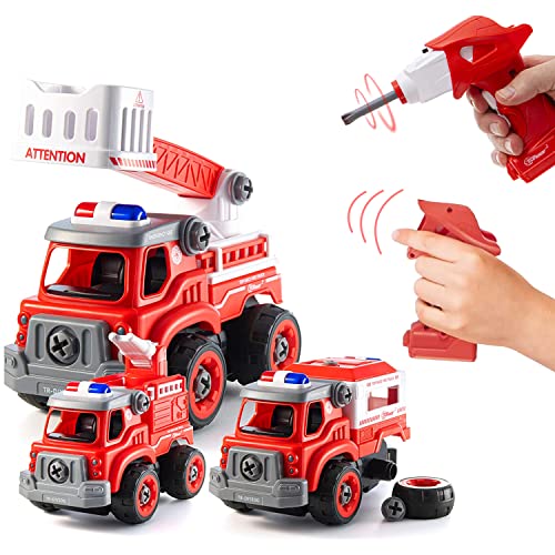 Top Race Firetruck Toy with Battery Powered Drill – Heavy Duty 3-in-1 Take Apart Truck and Remote Control – Easy to Assemble Toy Firetrucks for Kids (Ages 3 and Older)