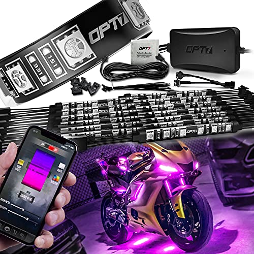 OPT7 Aura Pro Motorcycle LED Light Kit Smart Brake RGB Multi-Color Bike Underglow Neon Light Bluetooth APP, Motorcycle Under Glow Strips Switch for Cruisers, 14pc, IP67 Waterproof 12V, iOS Android